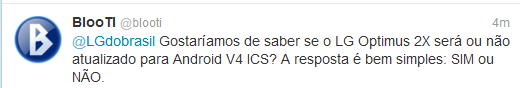 Agora a LG anunciou que o update está em desenvolvimento, pelo menos para os aparelhos MADE IN KOREA. Quando chegará ao Brasil e se chegará ao Brasil ainda não sabemos... Esperamos que sim, enquanto isso vamos aguardar. O LG Optimus 2X é um aparelho com recursos de hardware bem avançados e suporta tranquilamente a atualização para Android v4.0 ICS.