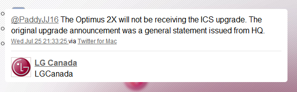 A poucos dias, através das redes sociais, anunciou que o LG P990 não seria atualizado.