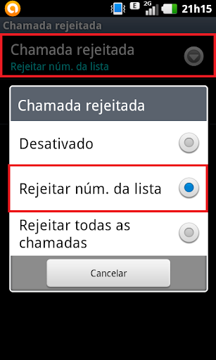 3º Em seguida selecione a opção "Chamada Rejeitada" e marque a opção "Rejeitar núm. da lista"